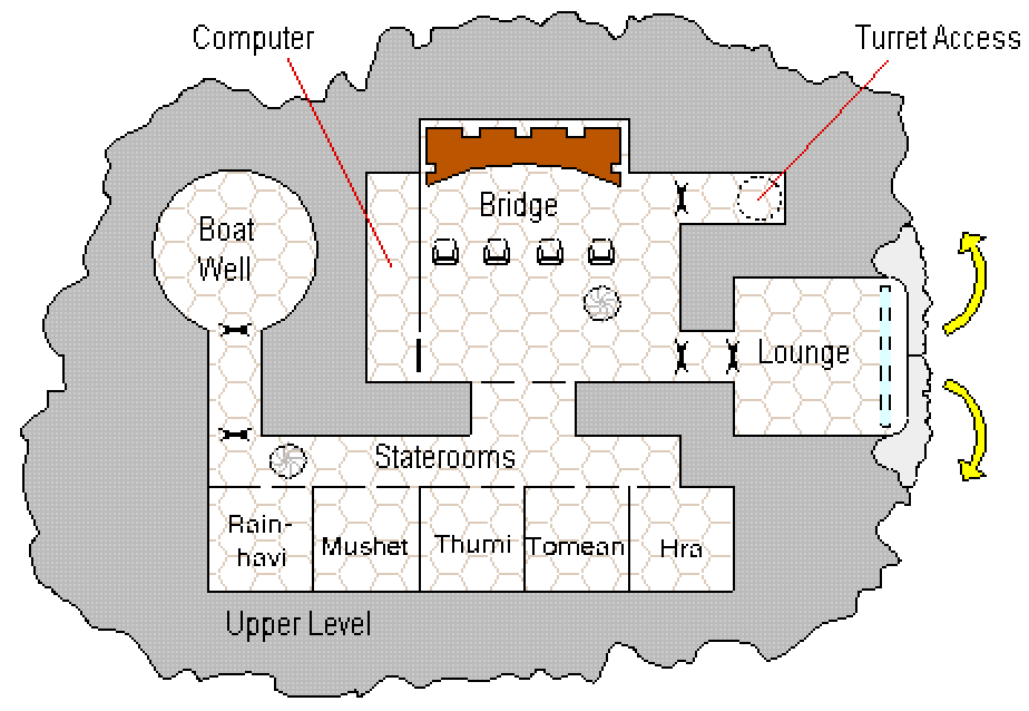 The PCs are in the upper level of a Jindarain asteroid ship. They are either sneaking about--probably with Shindar, the original Jindarian owner; being entertained by some Orions, the new owners; or fighting for their lives.